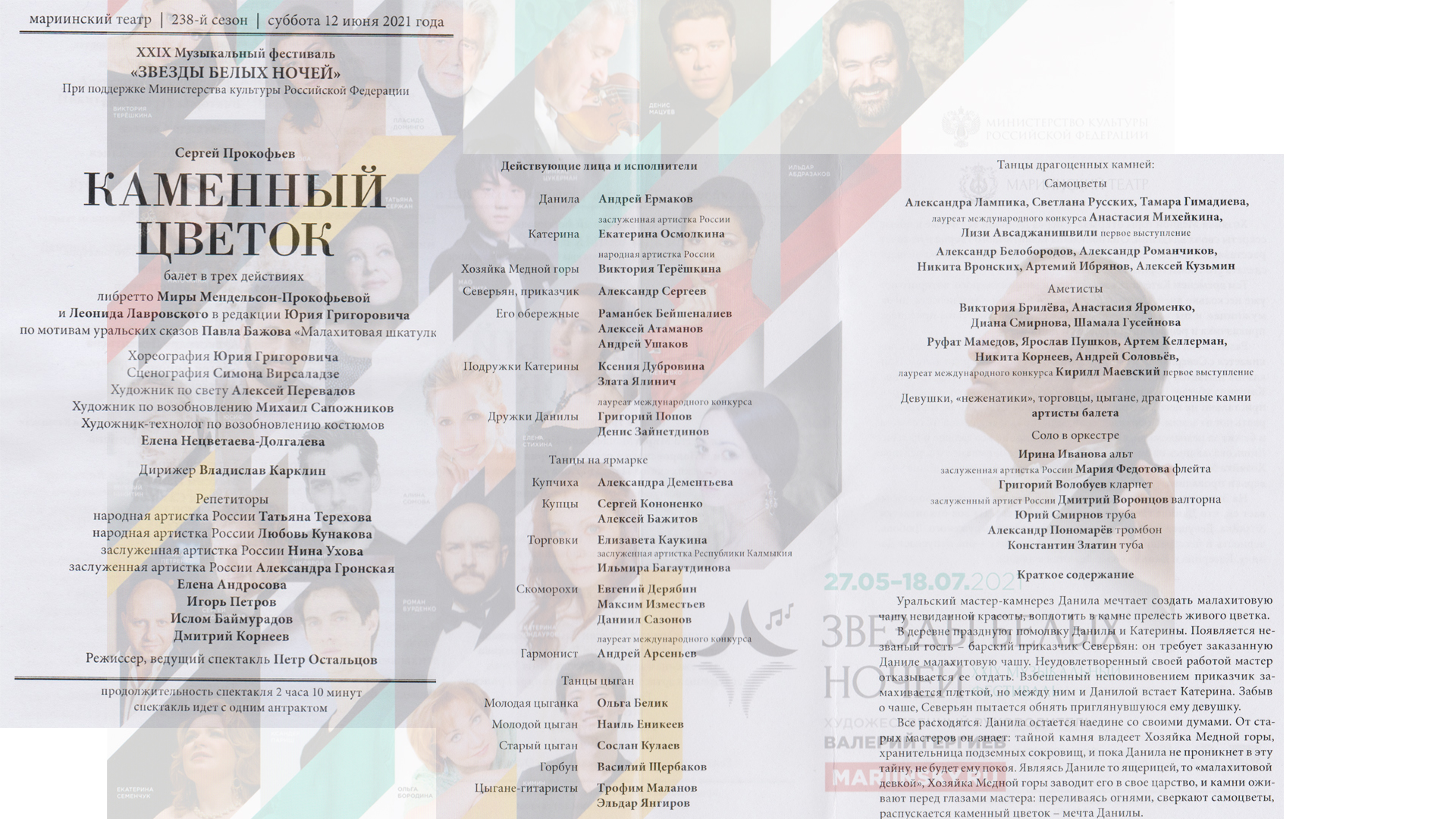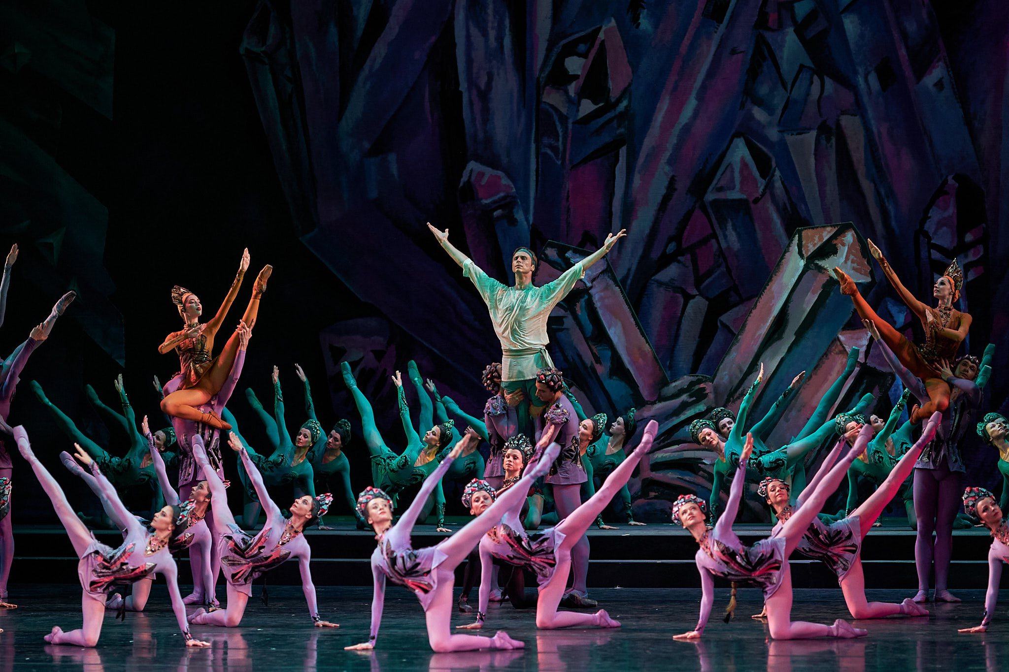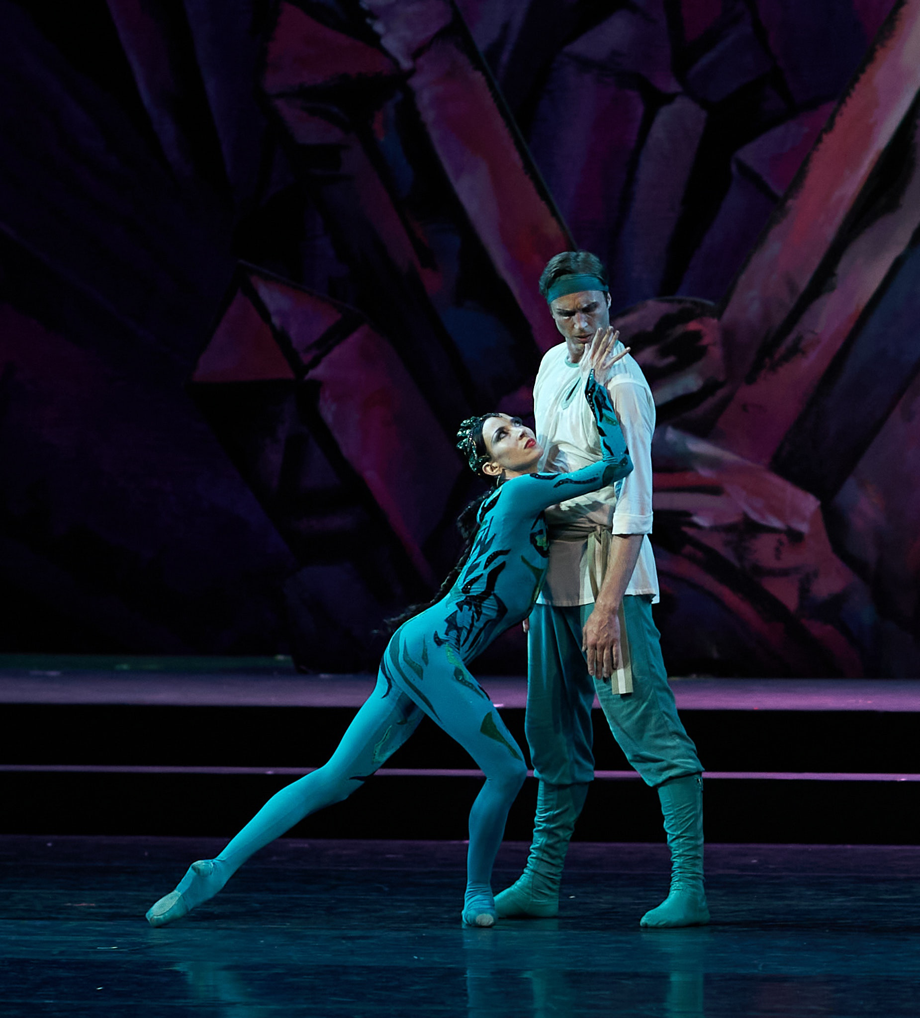 В «Каменном цветке» все имеет значение и подчинено замыслу художника: декорации, костюмы, цвет, не говоря о хореографии, в которой каждое движение неслучайно, а кордебалет в масштабах всего повествования едва ли не важнее, чем солисты и характерные танцы. Два действия предельно насыщенны, каждый момент добавляет новые детали, оттенки, грани, раскрывая, обогащая сказовое пространство, погружая зрителя в недра загадочной Медной горы, завлекая в удалой разгул раздавшейся русской ярмарки, безумной скоморошьей пляски, маня пьянящим чадом развязной, пугающей своей разнузданностью цыганщины.