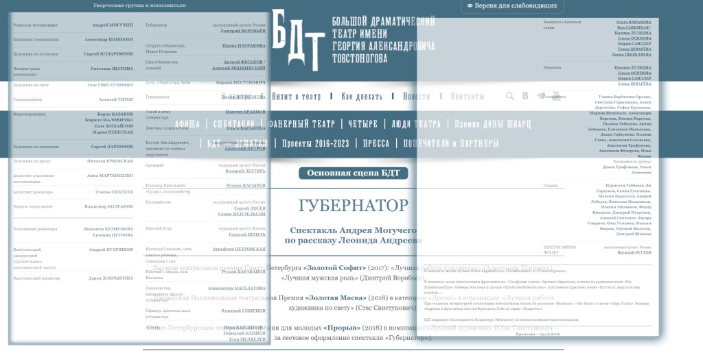 Это мой третий спектакль Могучего и он мне по-прежнему чрезвычайно интересен, насыщенностью действа и сценического пространства, полифоничностью и количеством мелких деталей, переходами от глубоко интимных переживаний рефлексирующего чиновника до дикого гула толпы, шокирующими кульминациями и накалом там, где его даже не ожидаешь, цветовыми решениями и незаурядностью актёрских работ в предельно режиссёрском спектакле, даже совсем эпизодических ролей вроде рабочего Егора (Георгий Штиль) или гимназистки, написавшей губернатору письмо (Александра Магелатова).