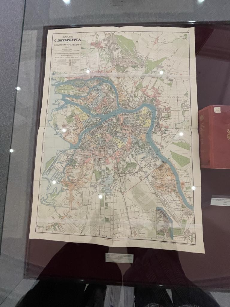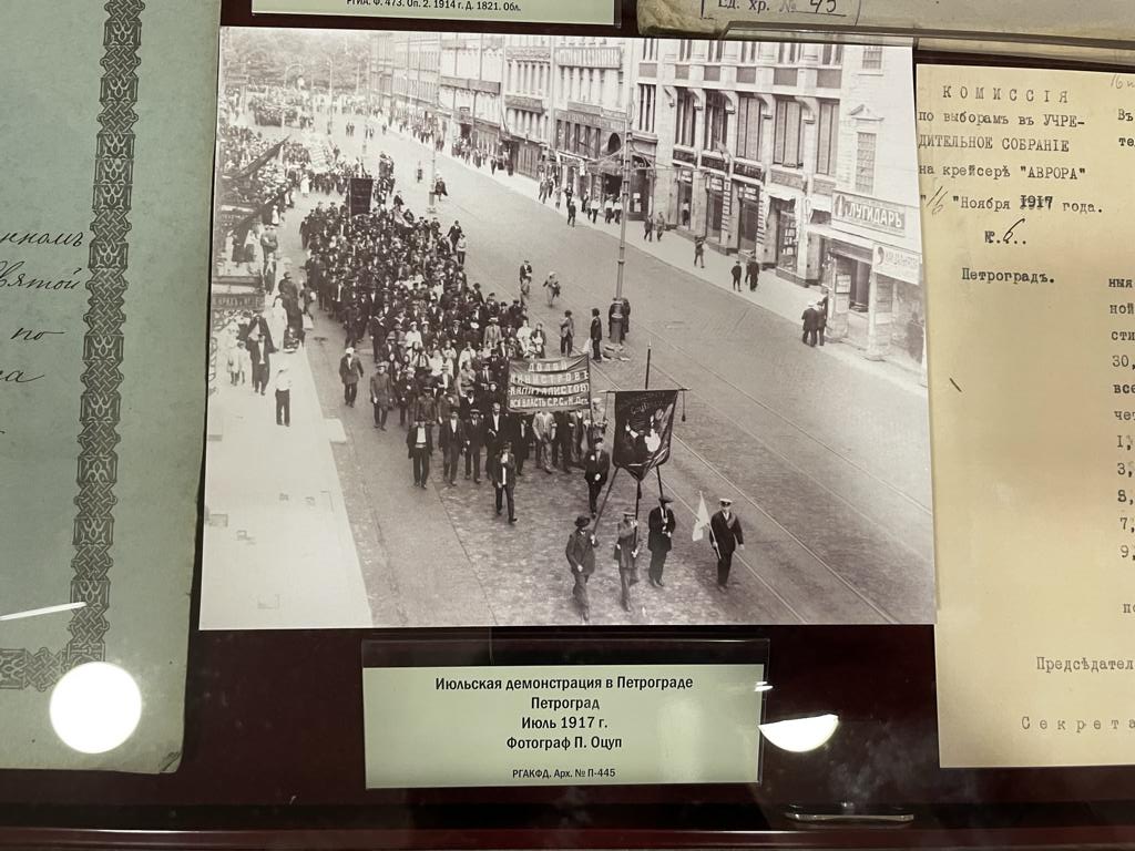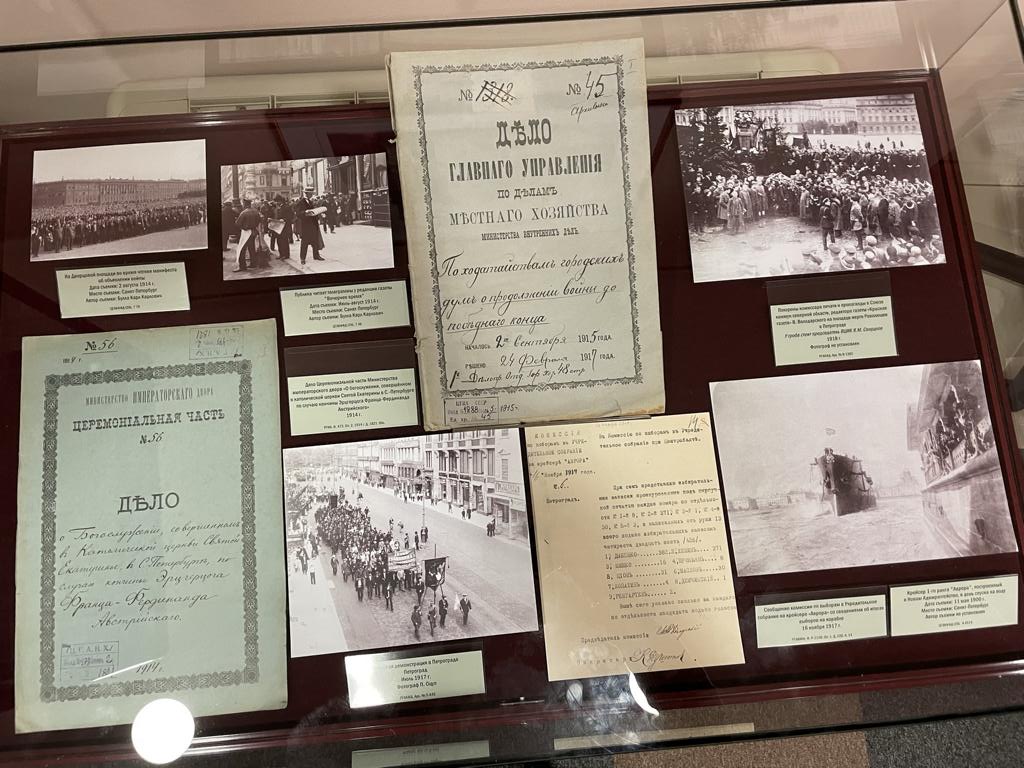 В рассказе о столичном статусе Петербурга — планы (на одном из них, датированном 1914 годом, мы нашли себя и соседствующее с нами с. Александровское, где в 1874 году родился Колчак), записки (одна из них прелюбопытная — о выделении Петром I на похороны Леблона целых 500 рублей, после того, как он был царём нещадно поколочен!), эскизы , фотографии: затопленный Большой проспект В.О., Литейный проспект 1865 года, Александровская колонна 1861 года, июльская демонстрация 1917 года, результаты выборов в Учредительное собрание, которые выиграл Дыбенко и в которых почётное седьмое место с 4 голосами занял некто Лопатин, первый переводчик «Капитала» на русский язык, похороны Володарского.