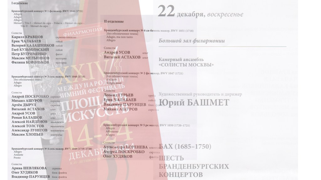 К сожалению, Большой зал филармонии не слишком подходит для камерной музыки: больше всего от этого пострадали флейты. Если поперечную в Пятом ещё хоть как-то было слышно, то блок-флейты (Олег Худяков, Владимир Парунцев) во Втором и Четвёртом потерялись совсем, и их чудесную перекличку со скрипкой (Арина Шевлякова) можно было только угадывать, проигрывая этот голос про себя.